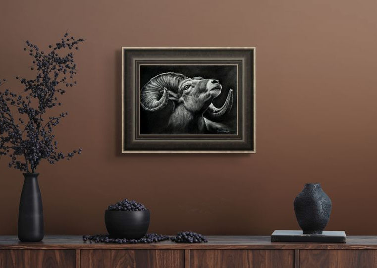 This powerful bighorn ram stands as a symbol of endurance, grace, and quiet strength that time cannot break. In his gaze lives the story of survival through resilience. “Born of Stone and Sky” is my tribute to that kind of strength, the kind that endures without needing to prove. Steady as stone, timeless as the sky. Every stroke of charcoal was laid to honor the resilience that lives in both nature and within us.