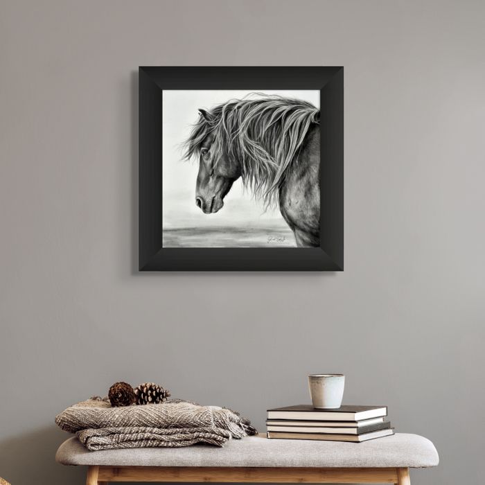 The wild horse has long stood as a symbol of unyielding spirit and untamed beauty. In my drawing, Freedom's Quiet Whisper, every strand of windswept mane and every detail of his face carries that legacy of strength, endurance, and quiet dignity. This artwork invites the viewer to feel the calm power of freedom. To bring this piece into your home is to surround yourself with resilience, grace, and be reminded each day of freedom’s call, of strength that endures in stillness, and of the unbroken bond between nature and the human soul.